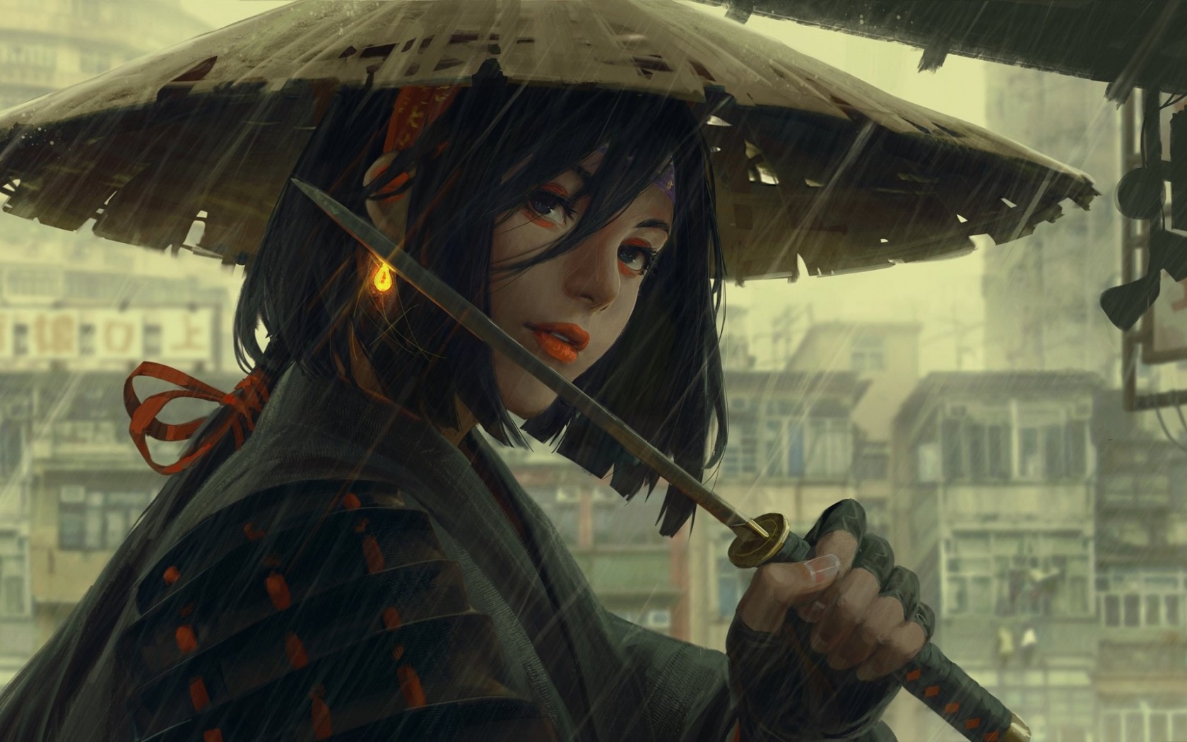 Description: A woman in a hat holding a sword in the rain with a city in the background in a video game.