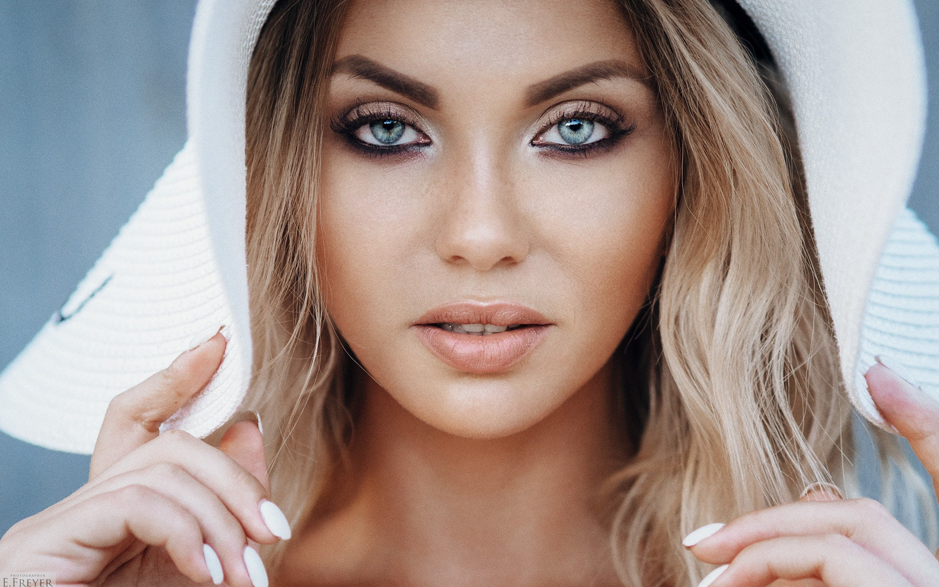 Description: A woman with a hat on her head and a white dress on her body and a blue eyeshadow.
