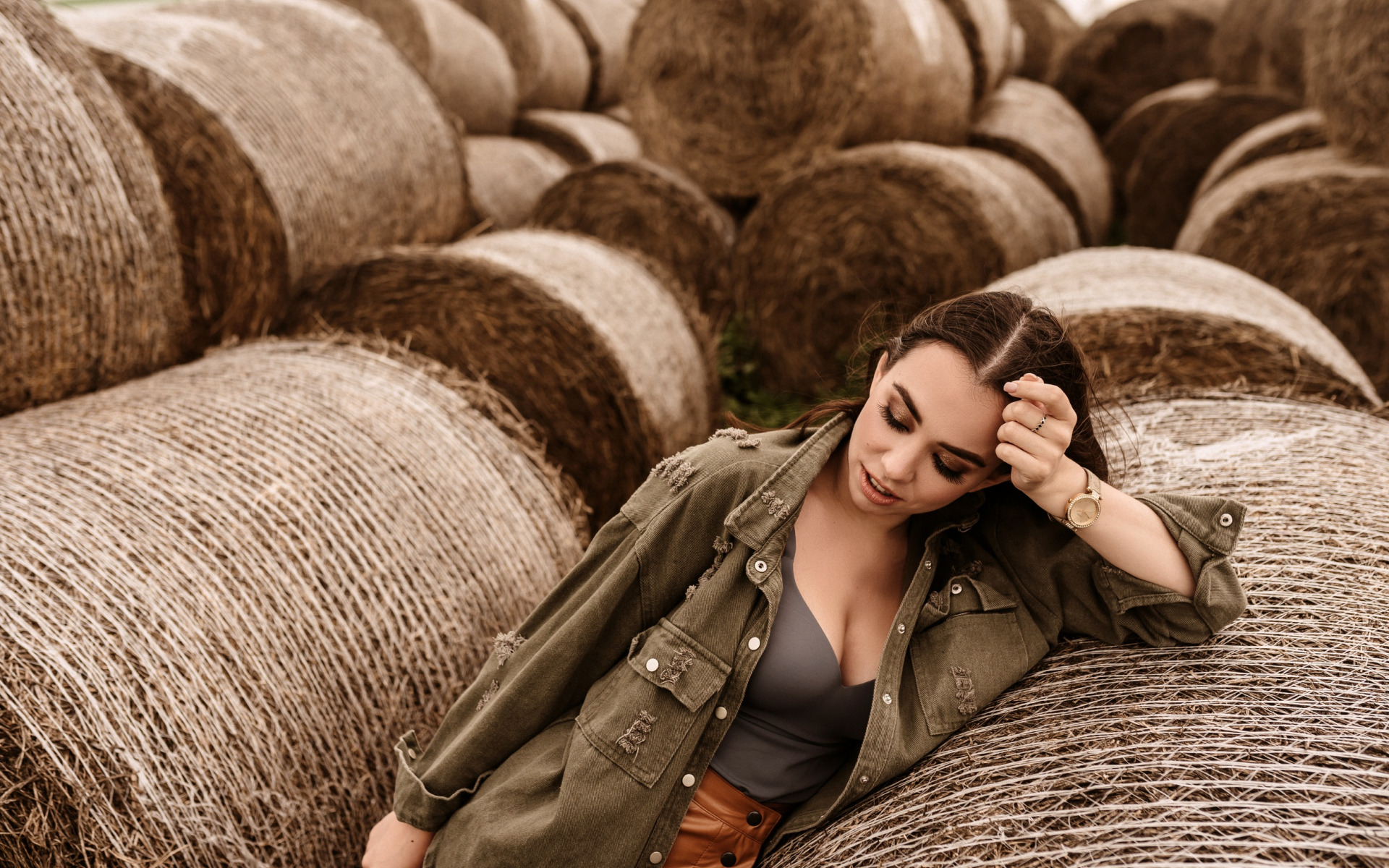 Description: A woman sitting on a pile of hay with her hand on her head and eyes closed.