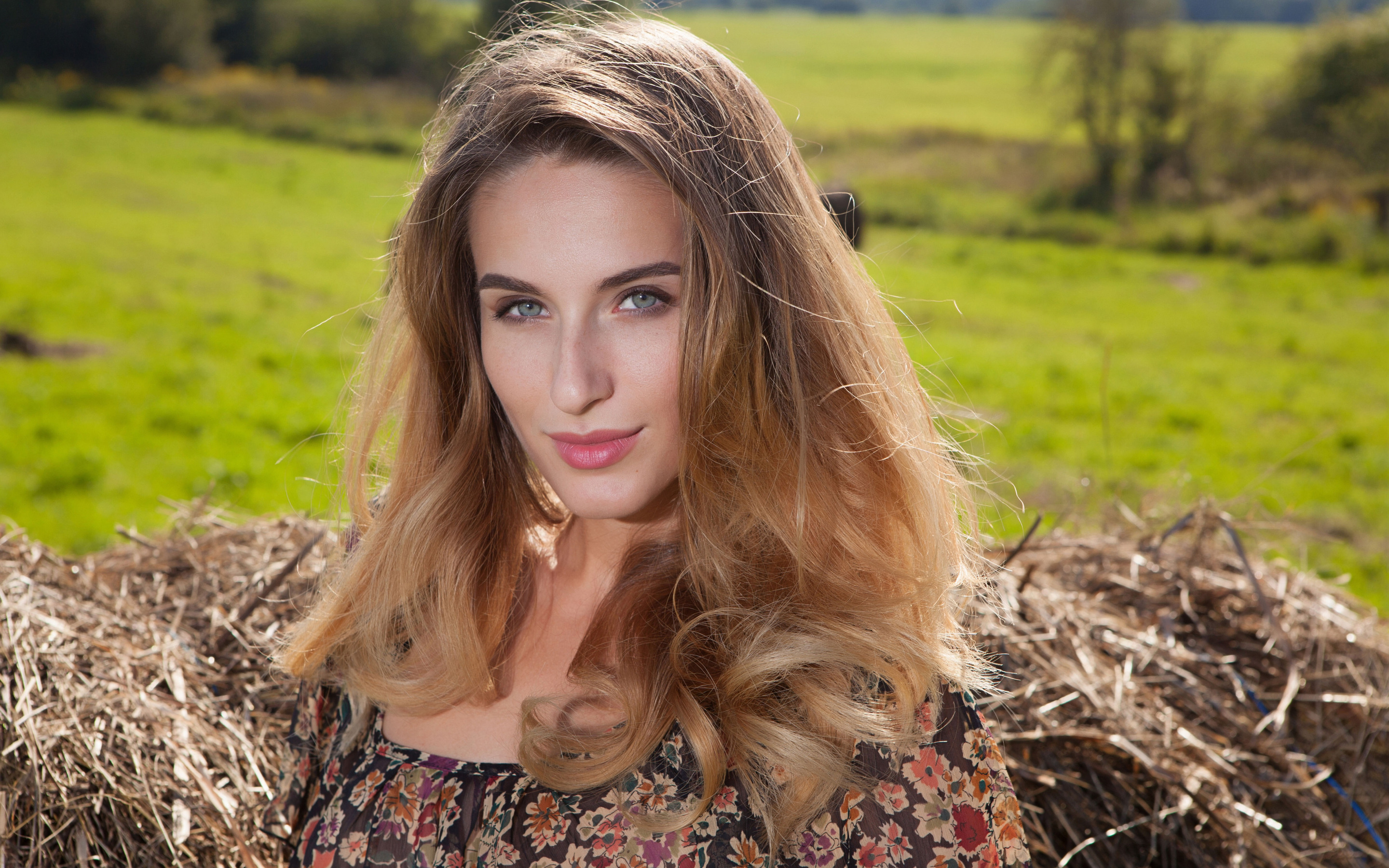 Description: A woman with long hair standing in a field of hay with a green field behind her and a green field behind her.