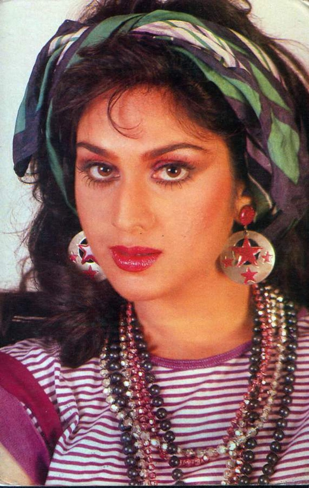 Description: A woman wearing a head scarf and earrings with a striped shirt and striped shirt on her chest and a striped shirt on her chest.