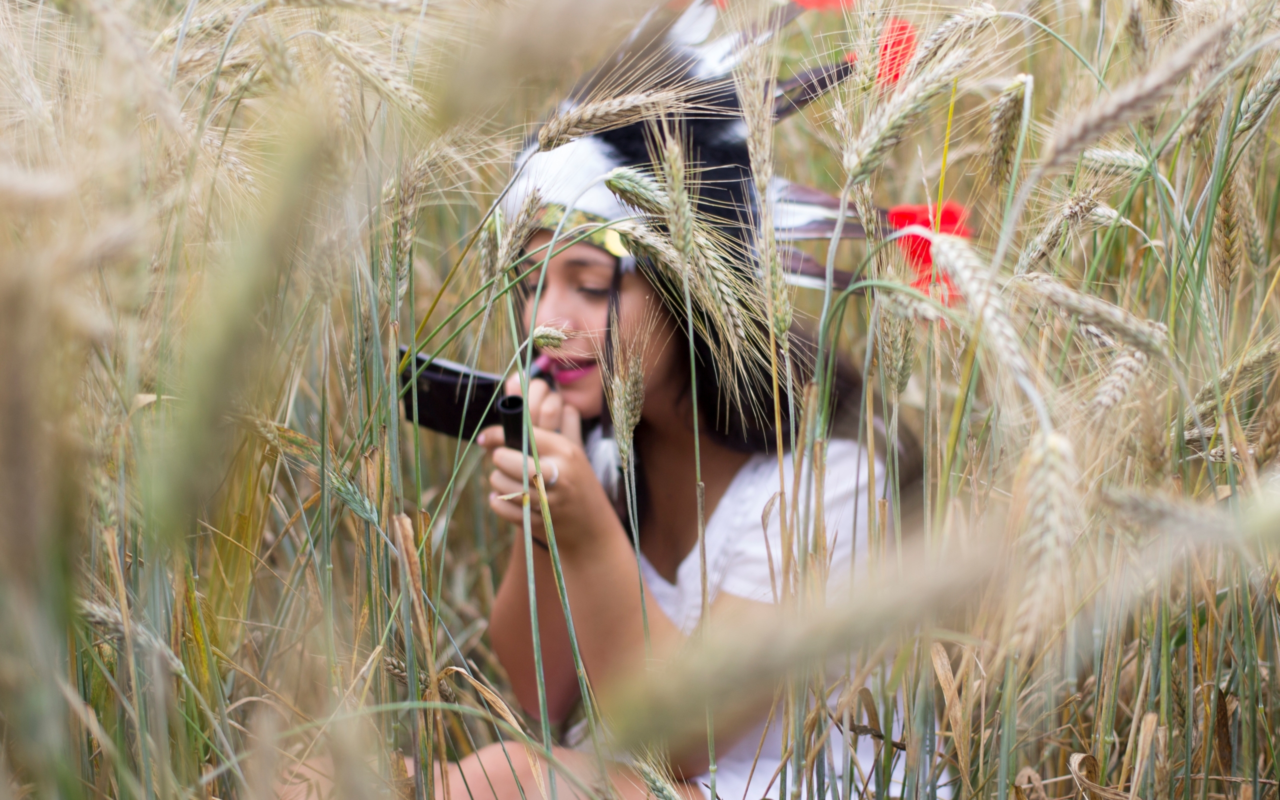 Description: A woman in a headdress is taking a picture in a field of wheat with a camera in her hand.