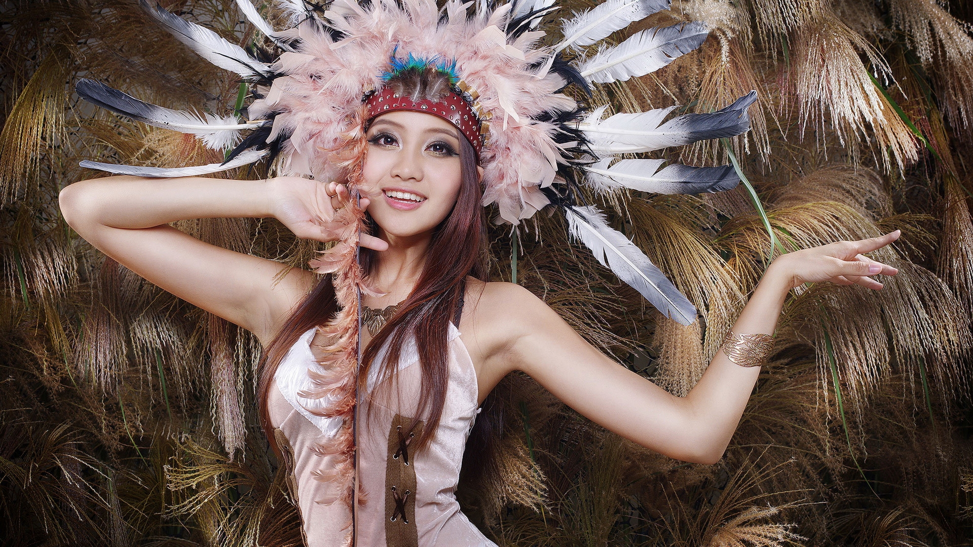 Description: A woman wearing a headdress and feathers on her head is posing for a picture with her hands in her hair.