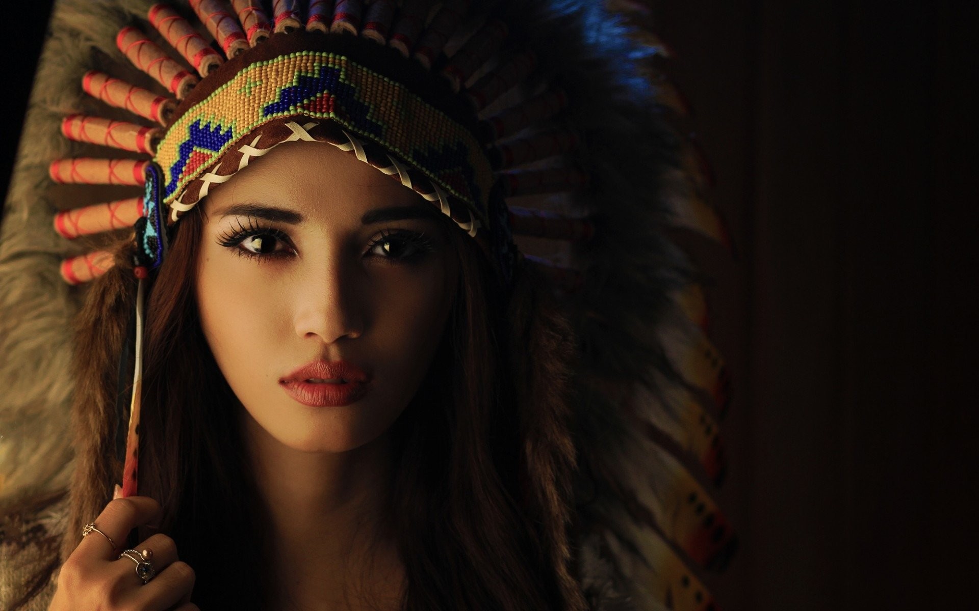 Description: A woman with a headdress on holding a stick in her hand and looking at the camera with a serious look on her face.