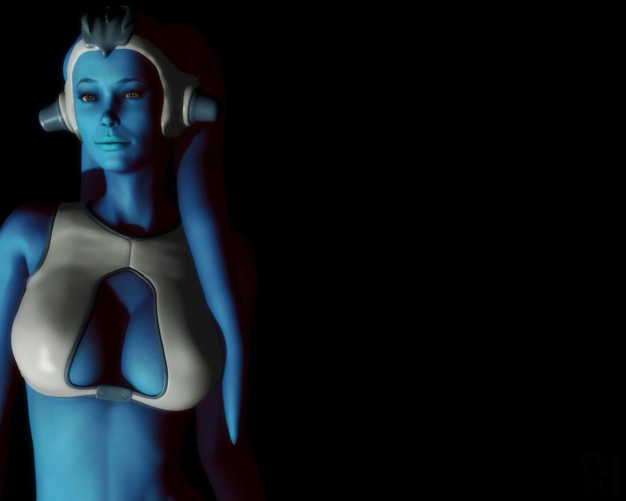 Description: A woman with headphones on her head and a blue body in the dark with a black background and a black background.