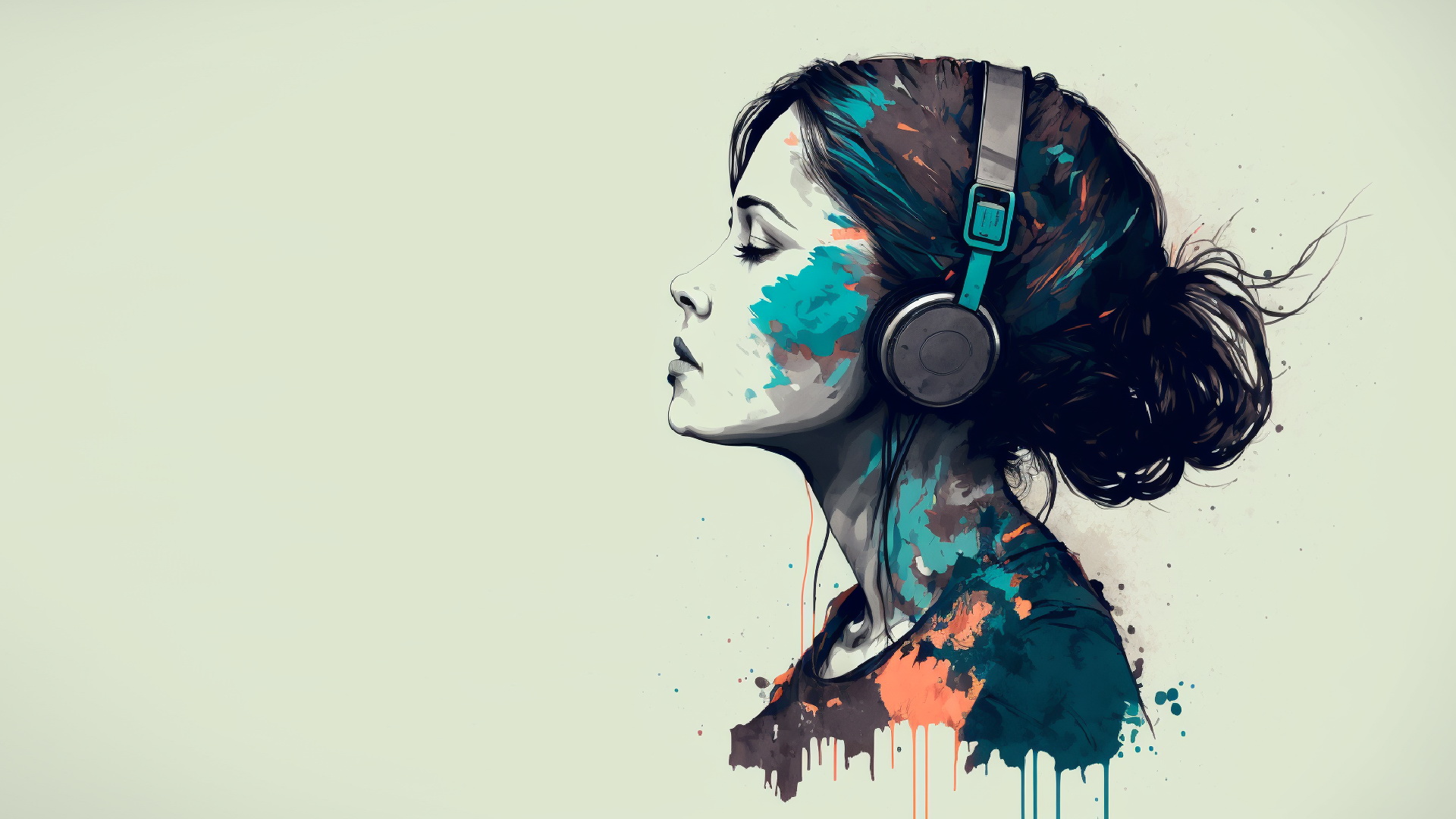 Description: A woman with headphones on her ears and a blue shirt on her shirt is shown in the background.