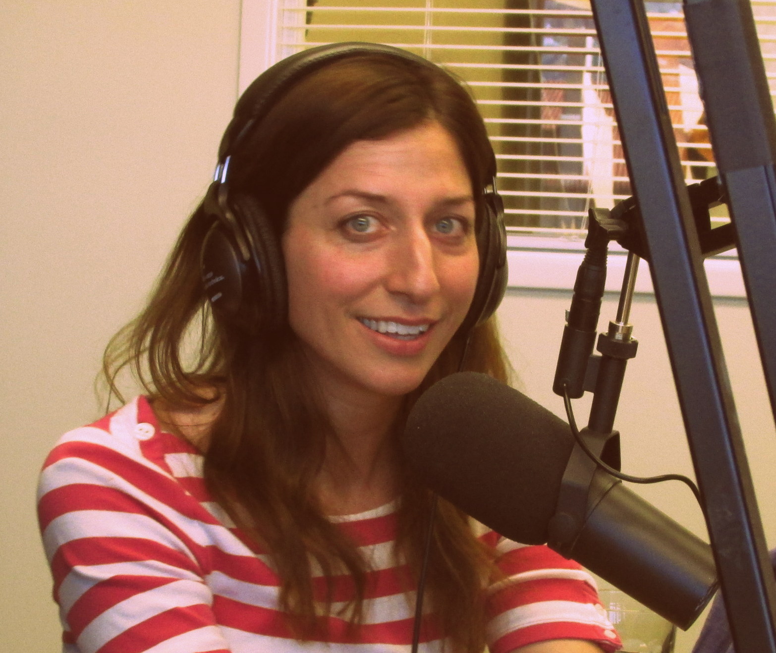 Description: A woman wearing headphones sitting in front of a microphone and microphone stand with a microphone in front of her.