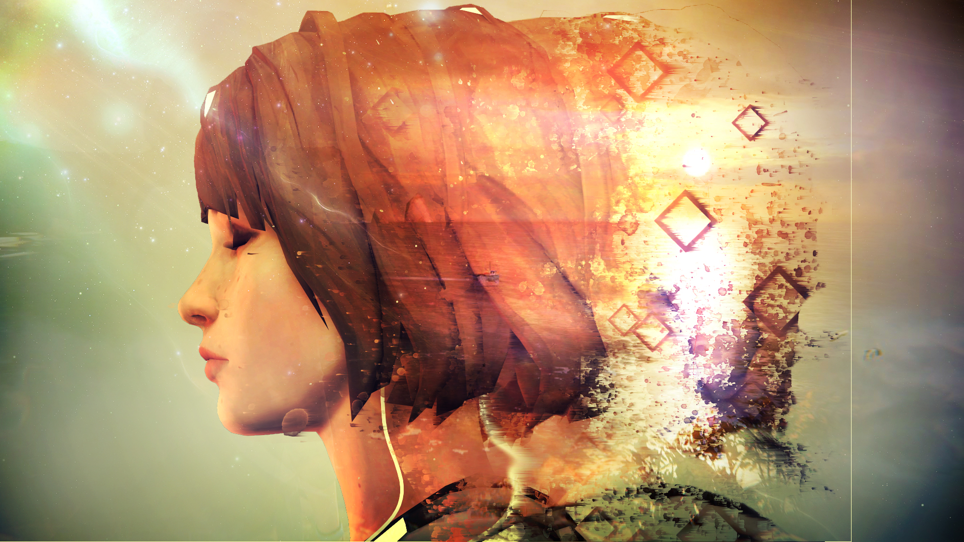 Description: A digital painting of a woman with headphones on her ears and a background of squares and diamonds and a diamond.