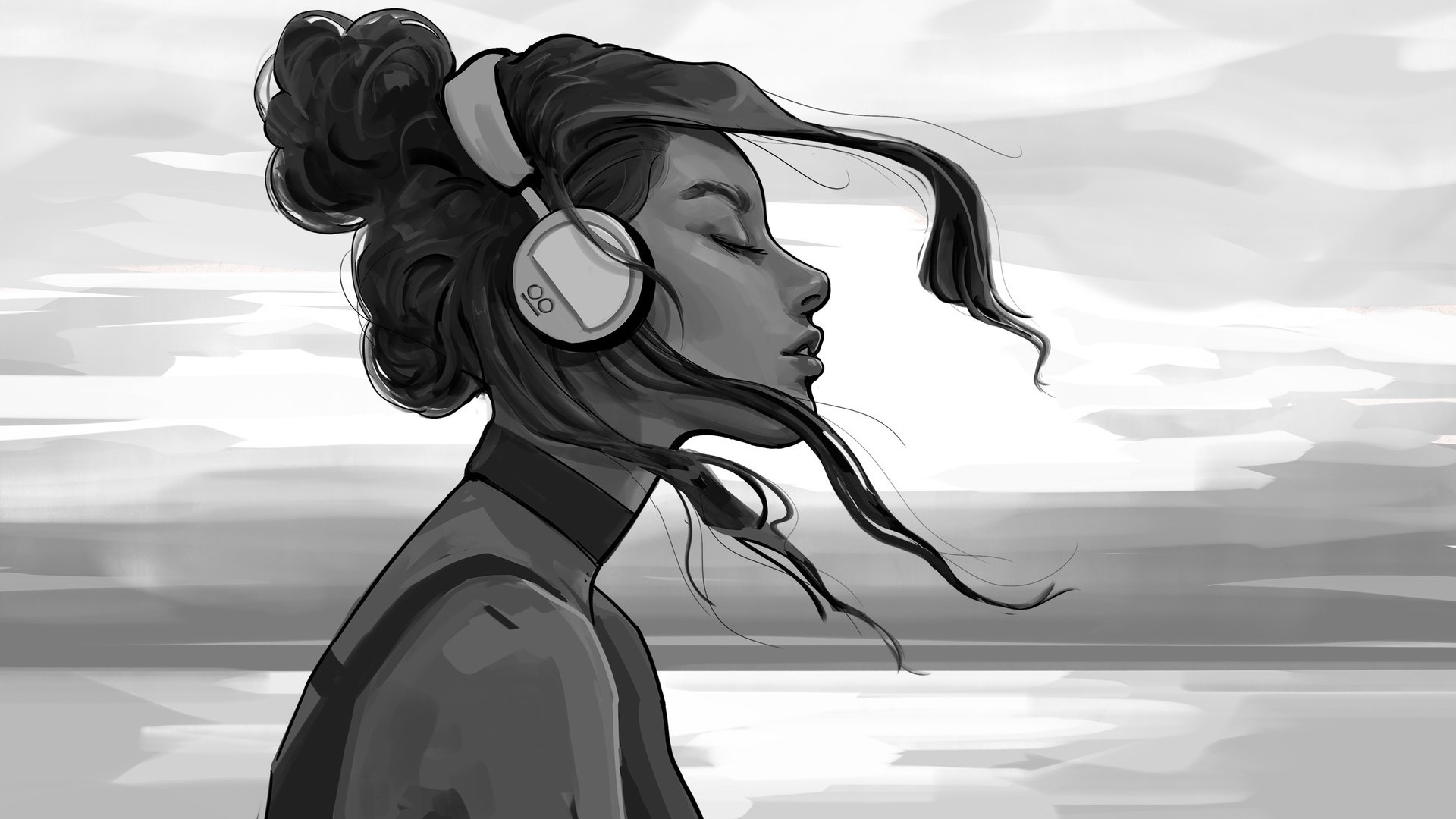 Description: A woman with headphones on her ears looking at the water and clouds in the background.