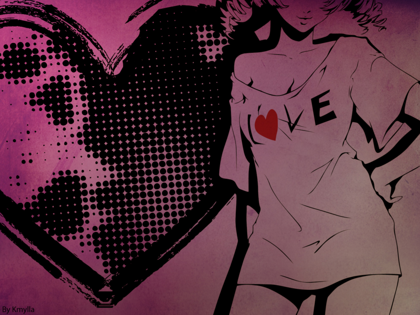Description: A woman with a heart on a wall with a pink background and a black and red heart on the wall.