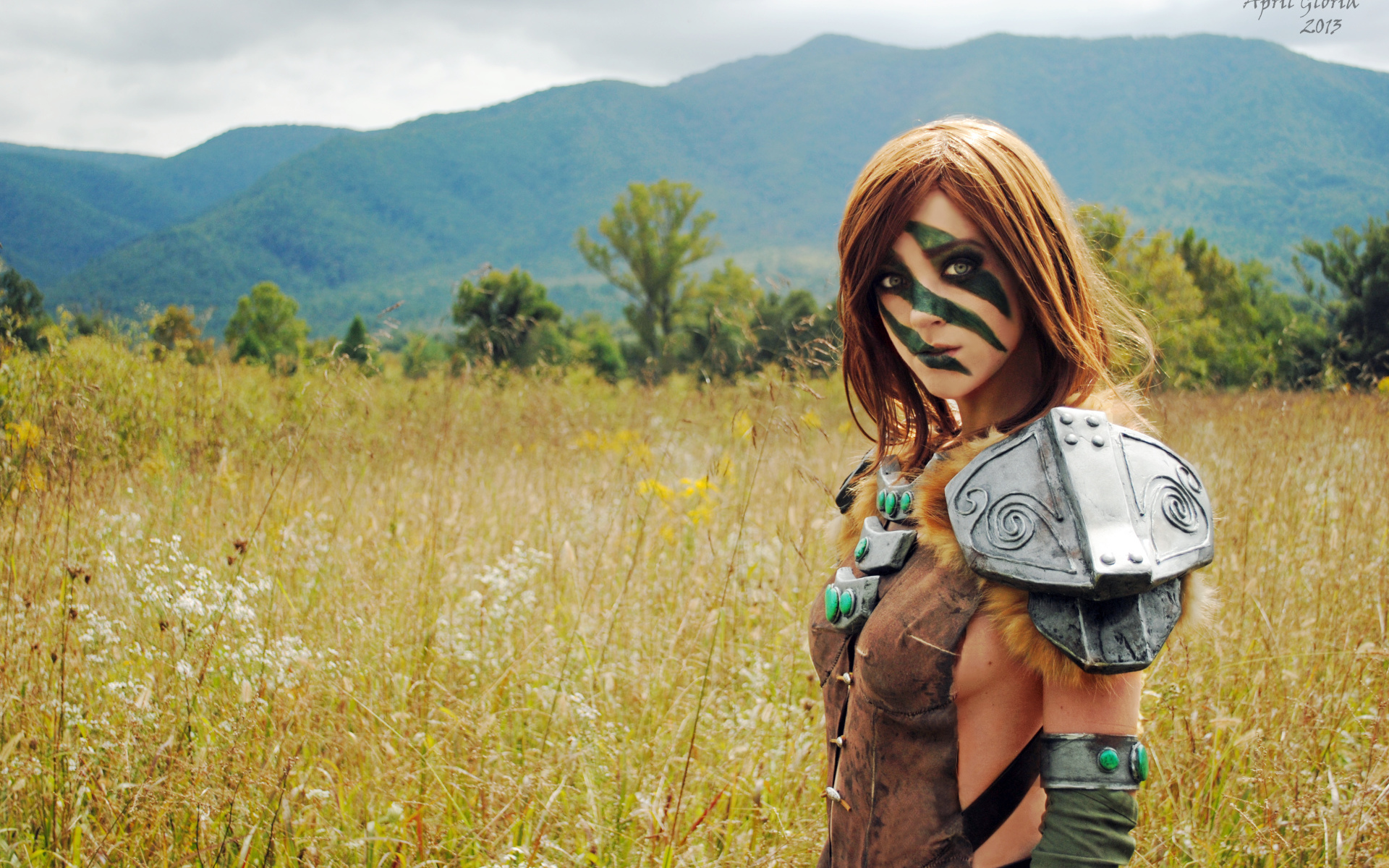 Description: A woman with a helmet and a body paint is standing in a field of grass with mountains in the background.