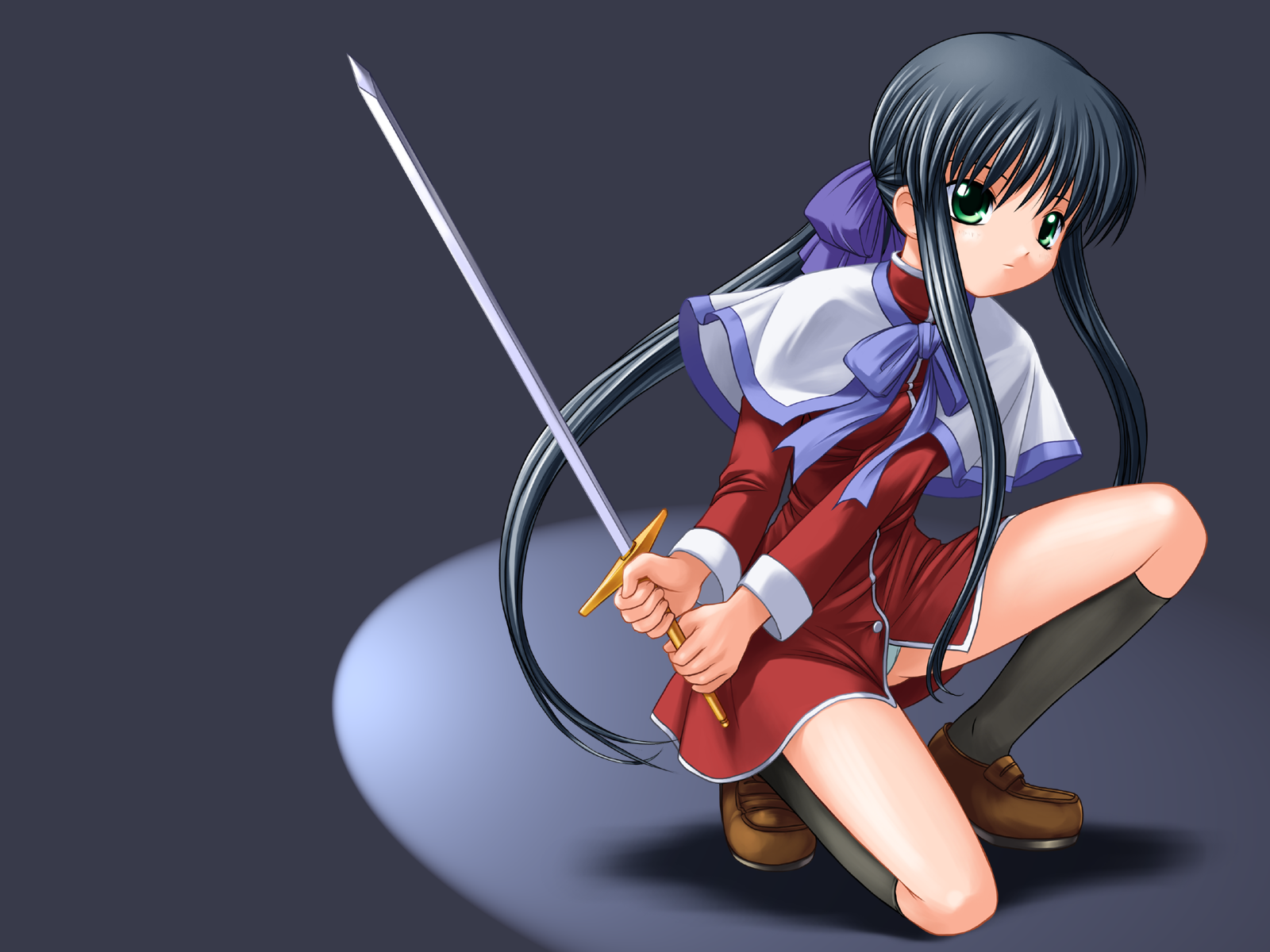 Description: A woman kneeling down with a sword in her hand and a sword in her other hand.