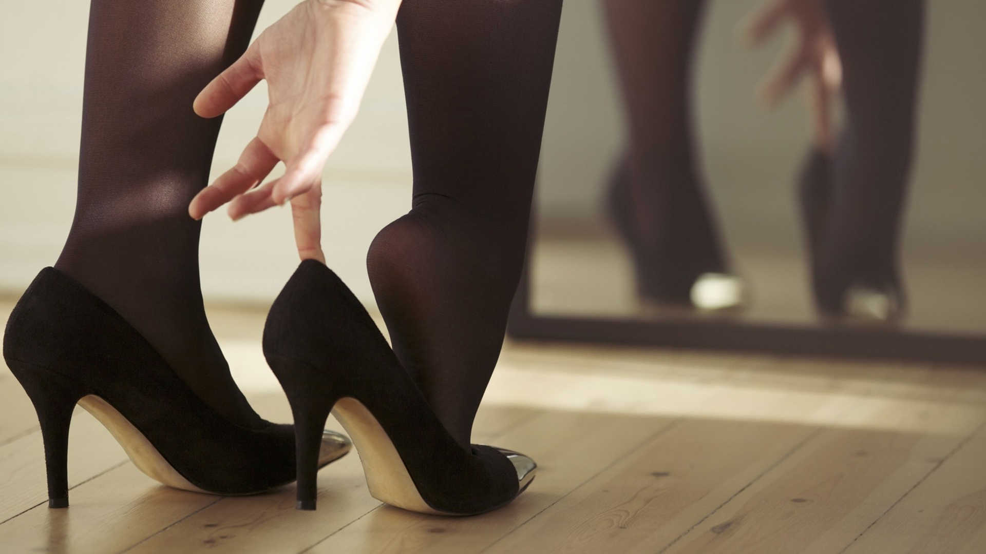 Description: A woman in high heels is standing on a wooden floor with her leg up and her hand on her heels.