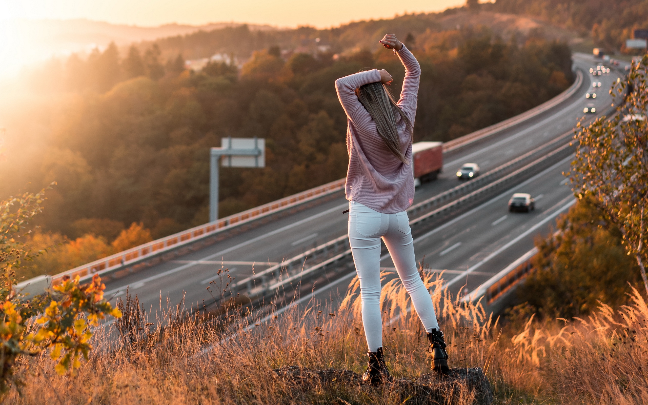 Description: A woman standing on a hill with her arms up in the air and a highway in the background with cars on the road.