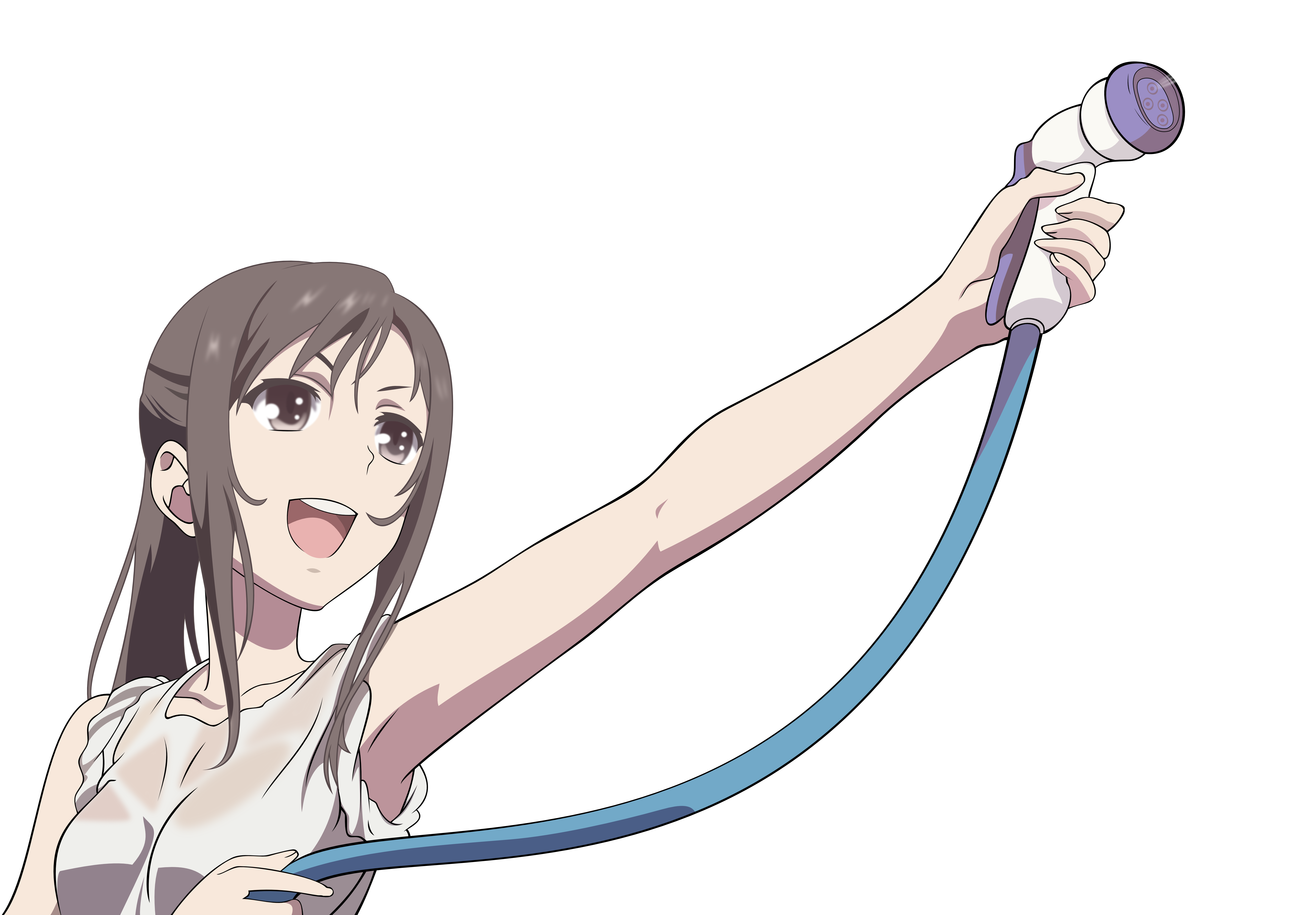 Description: A woman holding a blow dryer in her hand and a hose in her other hand.