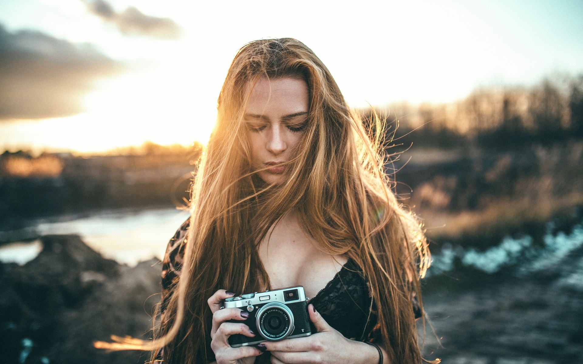 Description: A woman with long hair holding a camera in her hands and looking down at the camera lens.