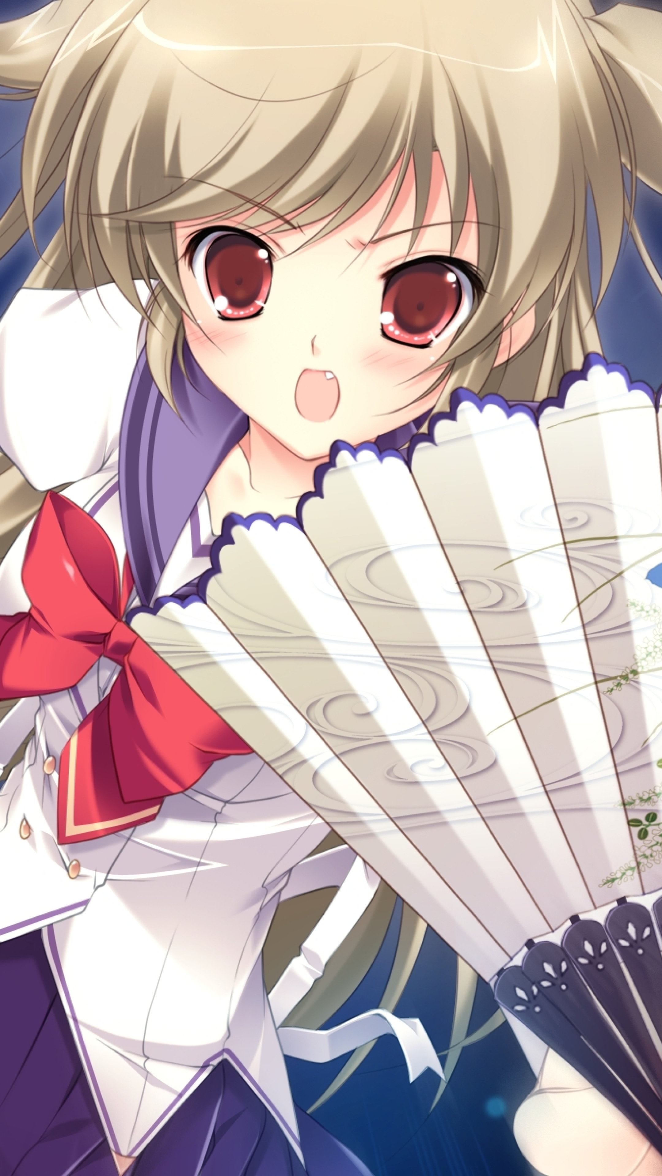 Description: A woman holding a fan in her hand and wearing a dress with a bow on it's neck.