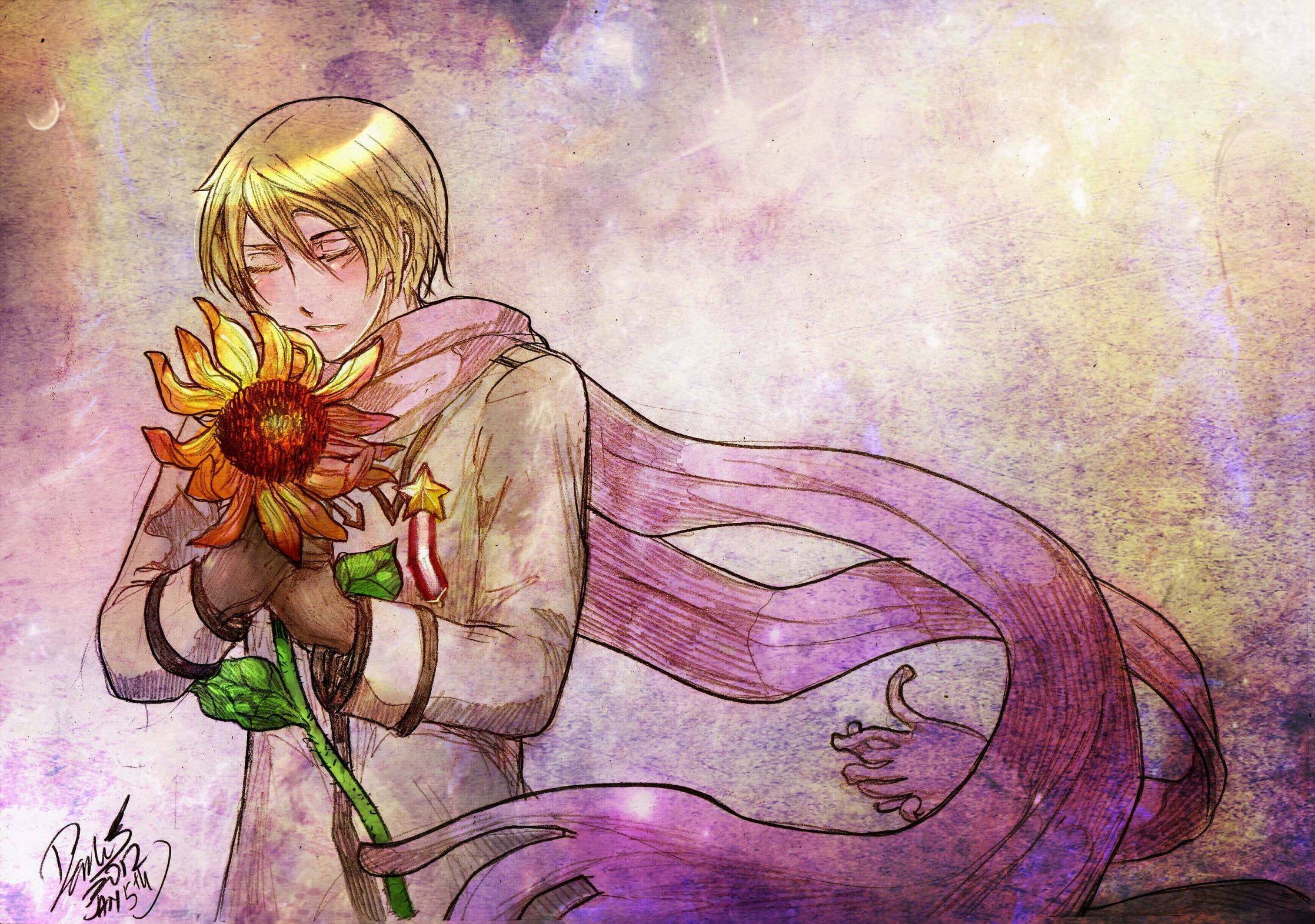 Description: A drawing of a woman holding a flower in her hand and a long purple scarf around her neck.