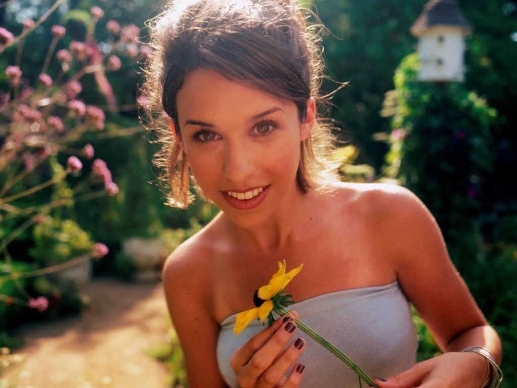 Description: A woman holding a flower in her hand and smiling at the camera with a house in the background and a path in the foreground.