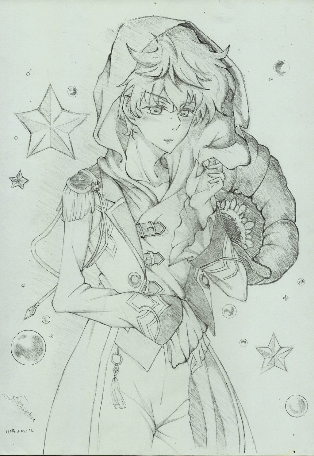 Description: A drawing of a woman holding a flower in her hand and a star in the background with stars on the ground.