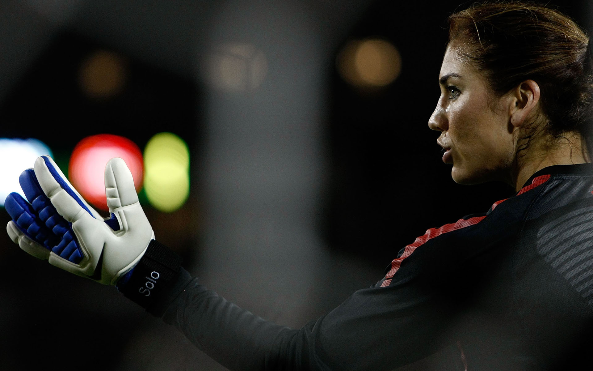 Description: A woman holding a glove in her hand with a blurry background of a street light in the background.