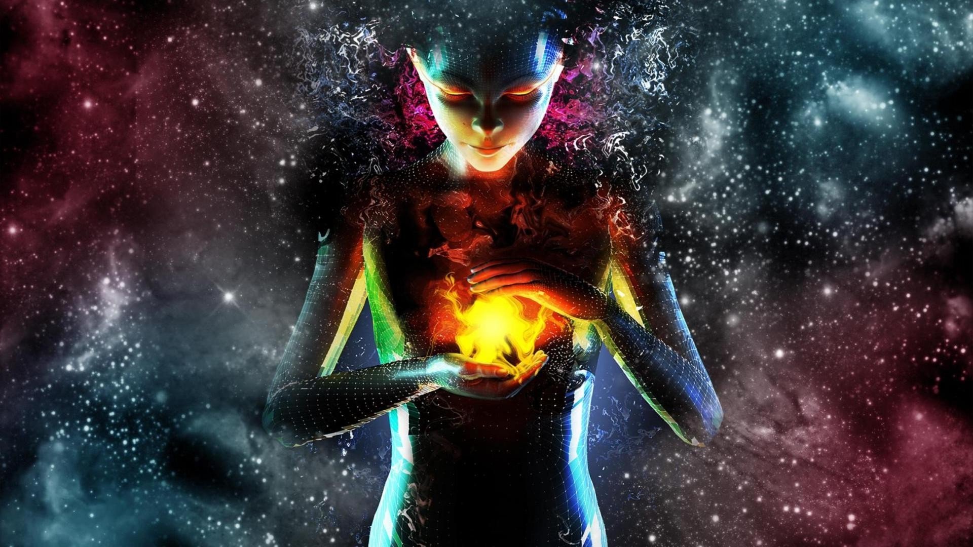 Description: A woman holding a glowing ball in her hands in space with stars in the background and a bright light shining on her chest.