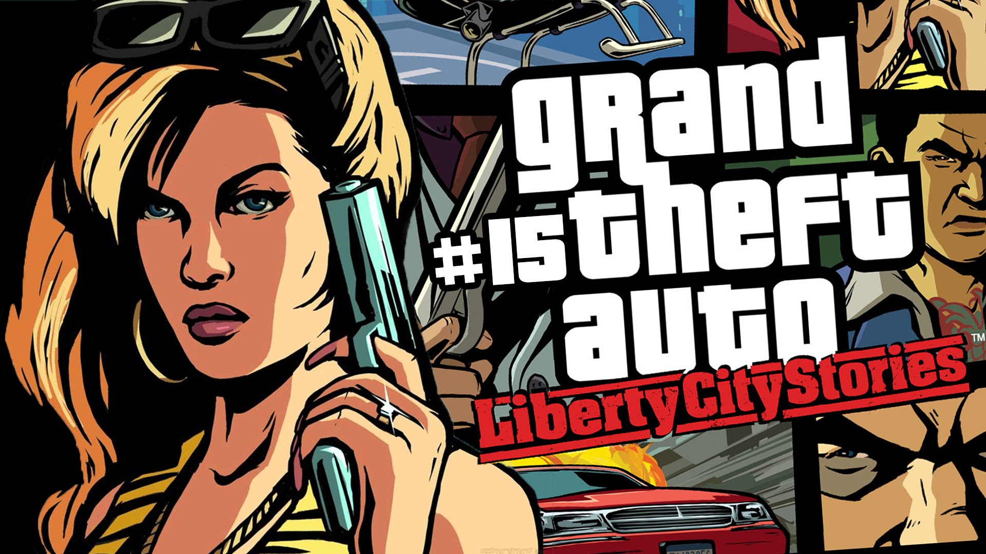 Description: A woman holding a gun in front of a poster of a man and woman with guns in their hands.