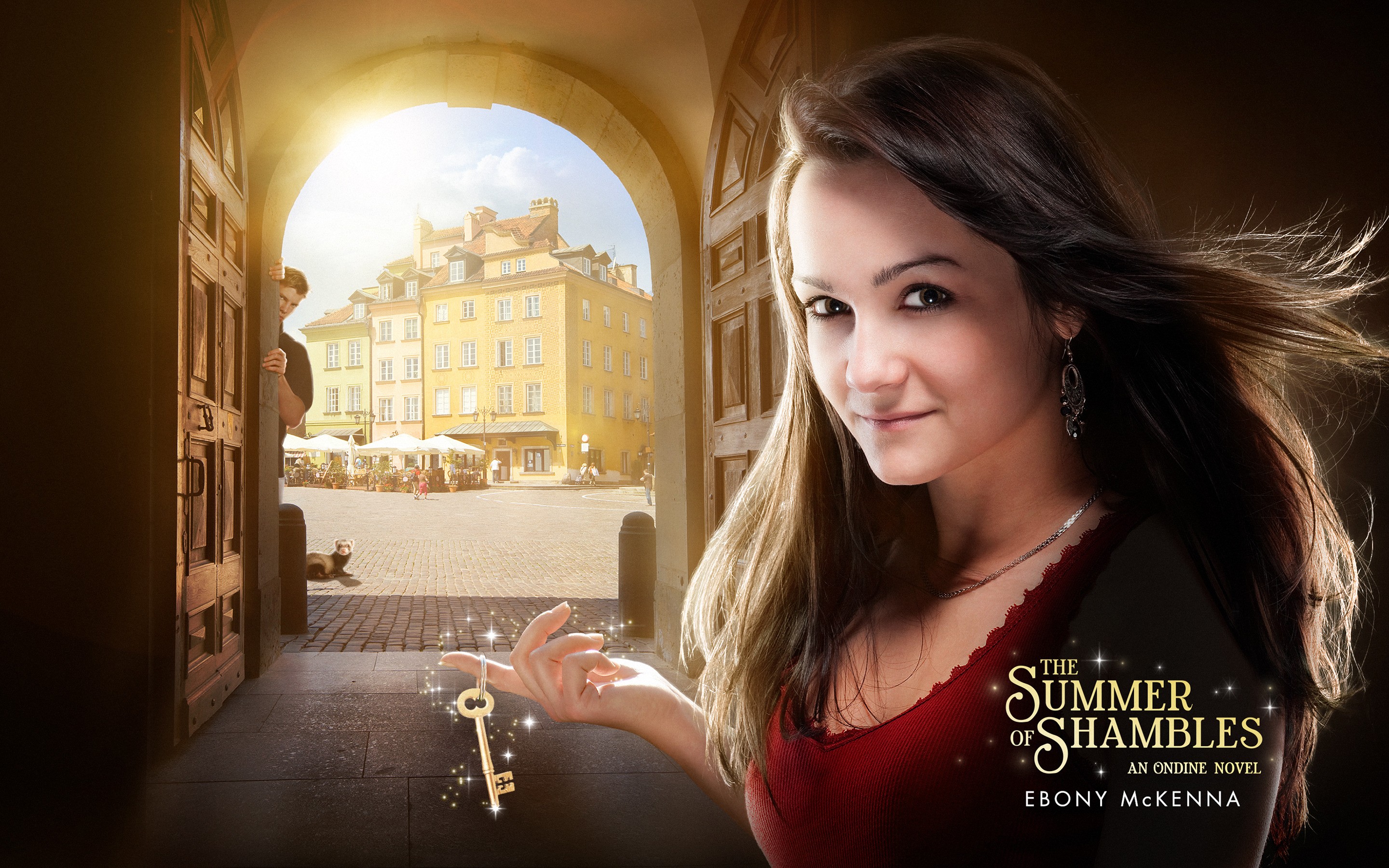 Description: A woman holding a key in front of a doorway with a building in the background and a man standing in the doorway.