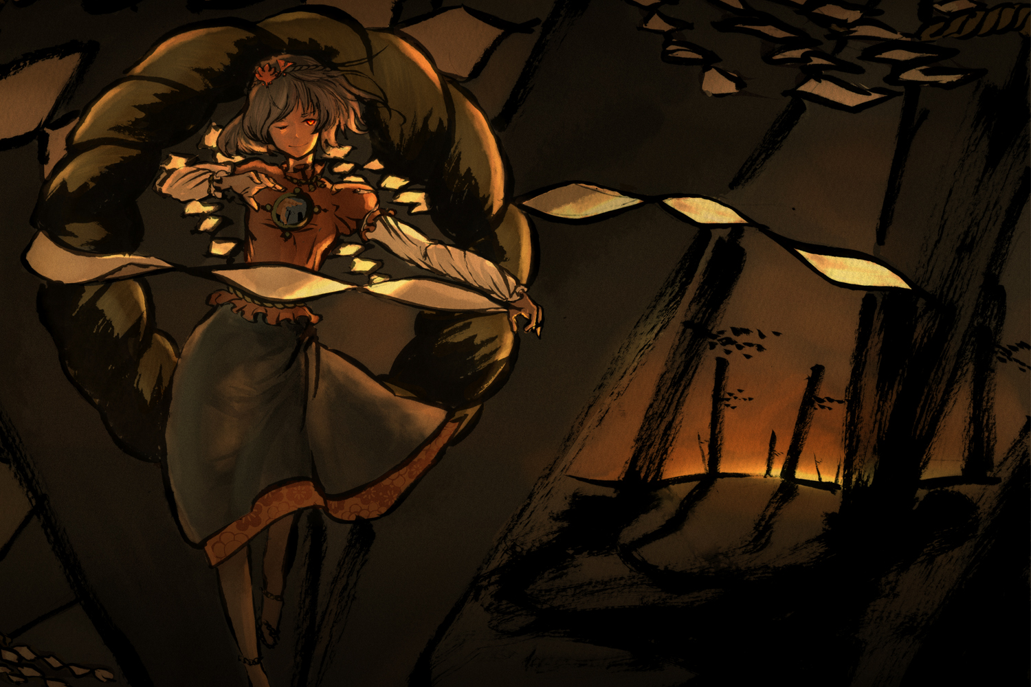 Description: A woman holding a knife in a forest with a fire in the background and a tree in the foreground.