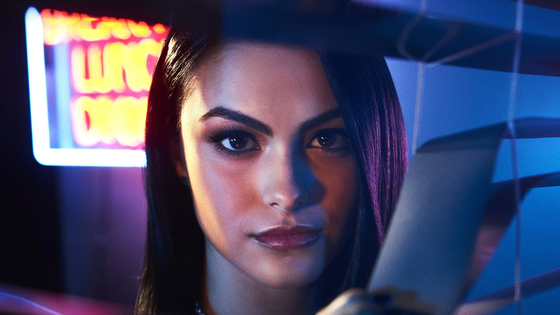 Description: A woman holding a knife in her hand in a room with neon lights and a neon sign behind her.