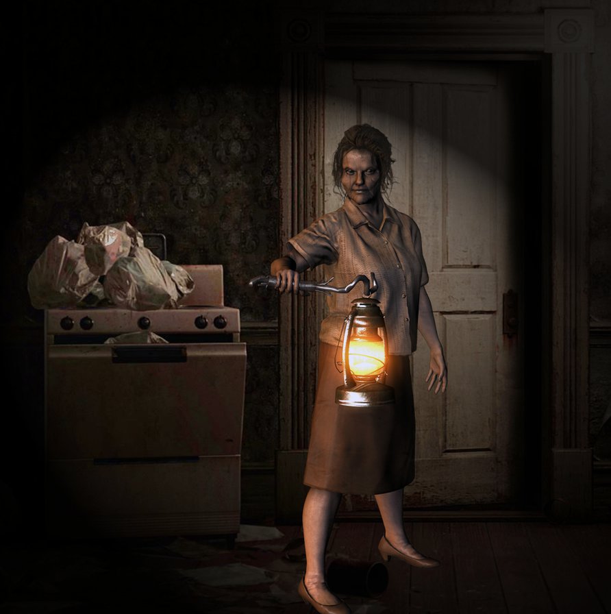 Description: A woman holding a lantern in a dark room with a creepy look on her face and hands.