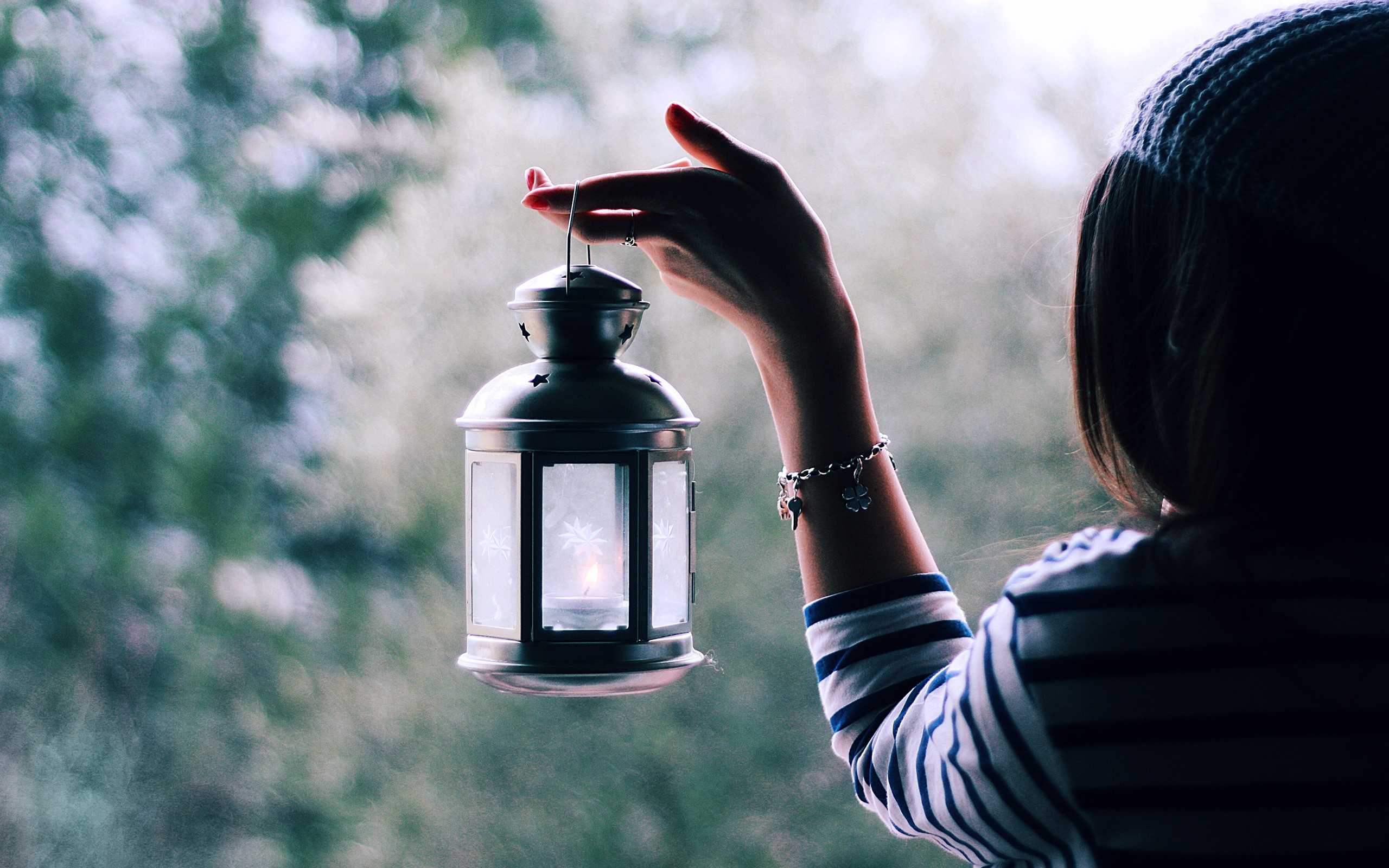 Description: A woman holding a lantern in her hand outside of a window with trees in the background and a forest in the background.