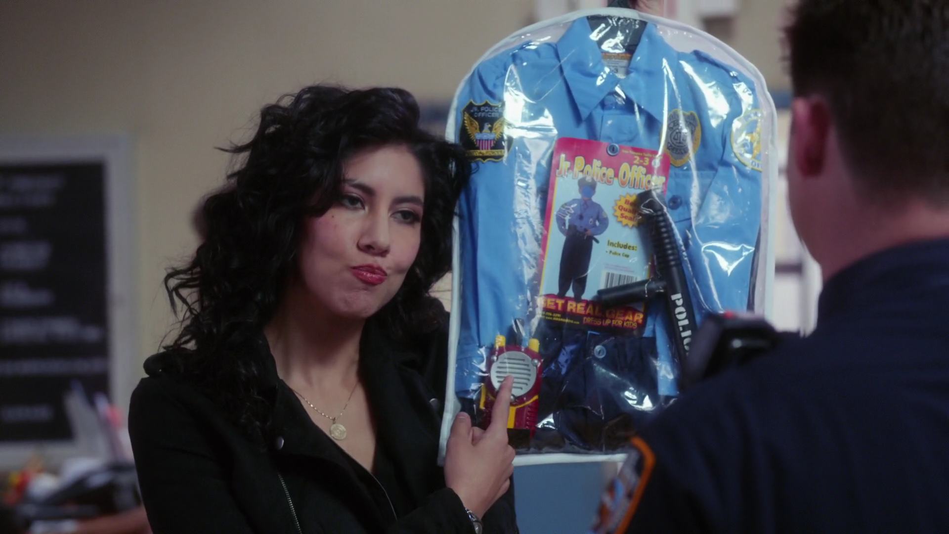 Description: A woman holding a package of hair dryers in her hands and a man looking at her in the background.