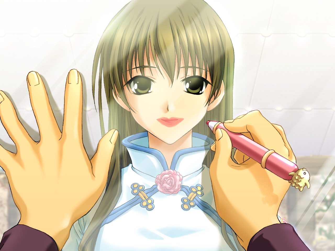 Description: A woman holding a pen and a pen in her hand with a hand gesture up to her face and a hand with a pen in her other hand.