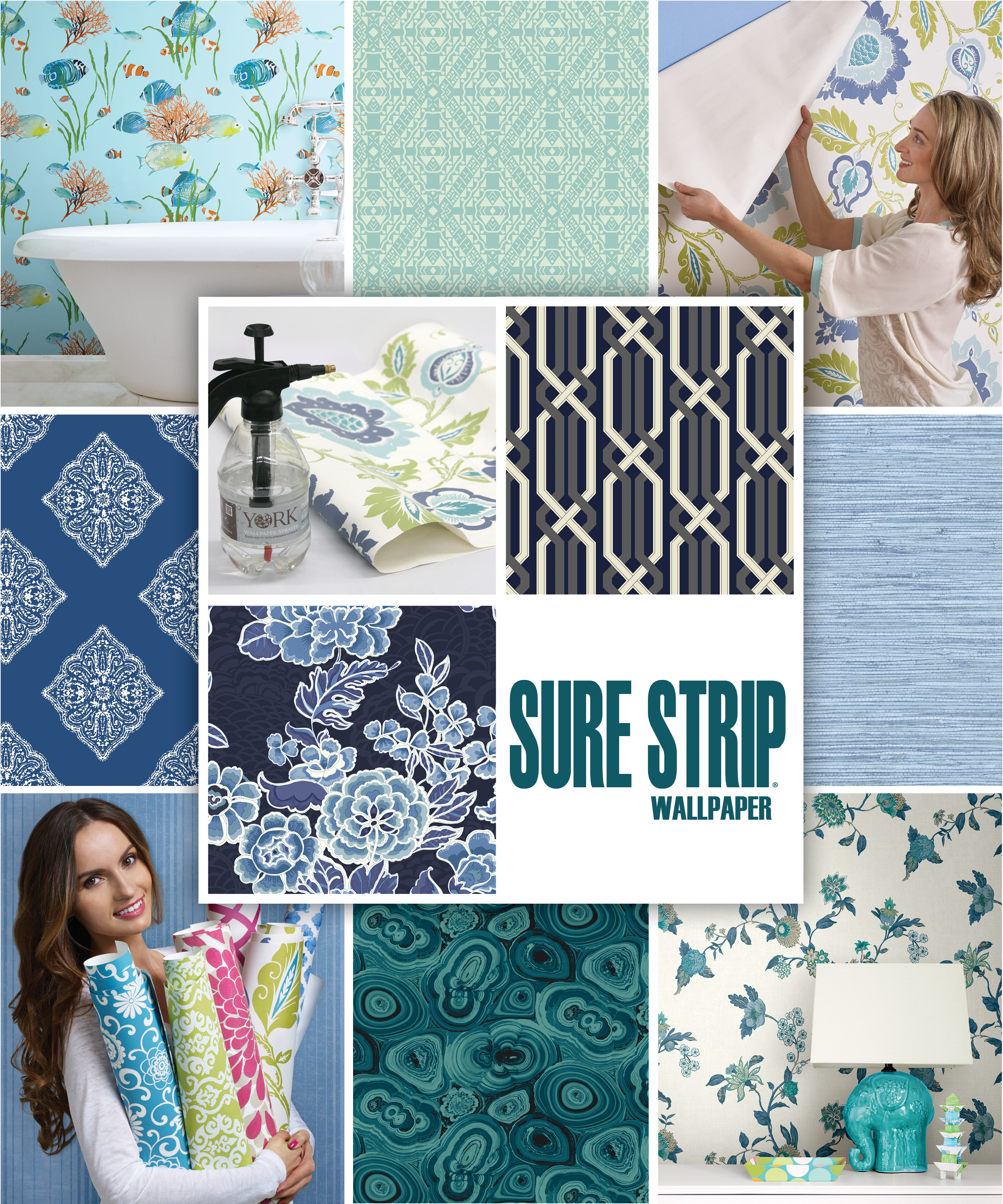Description: A collage of wallpapers with a woman holding a pillow and a lamp and a sink in the background.