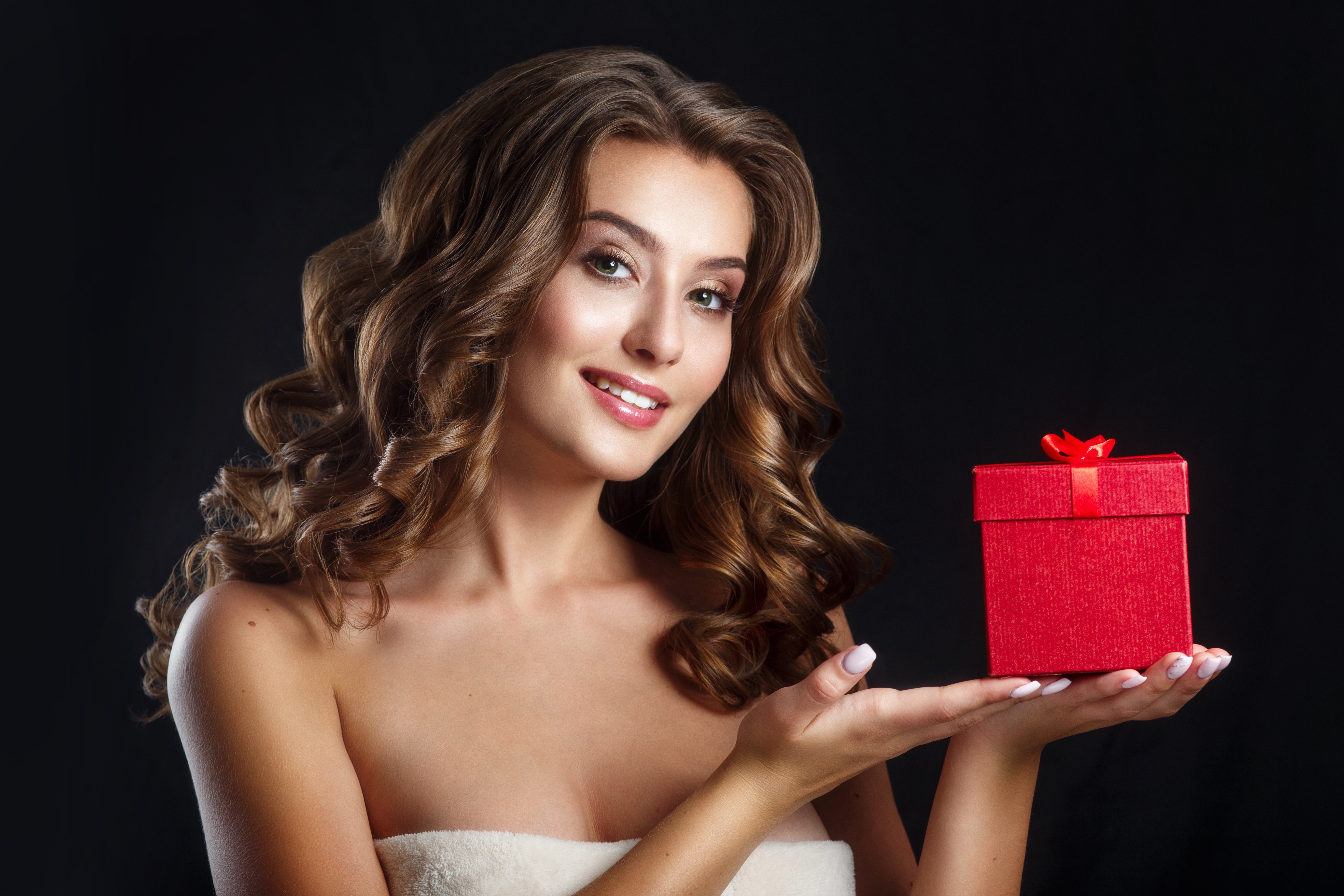 Description: A woman holding a red gift box with a red bow on it's ribbon and smiling at the camera.