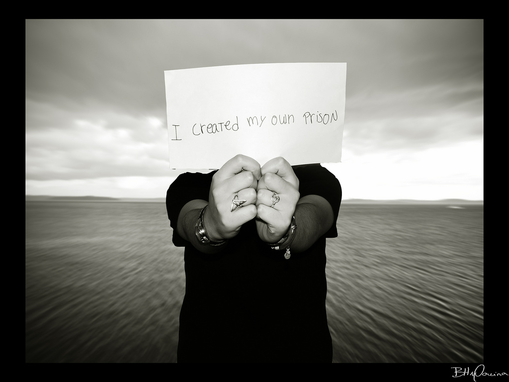 Description: A woman holding a sign that says i craves my own mind with her hands in front of her face.