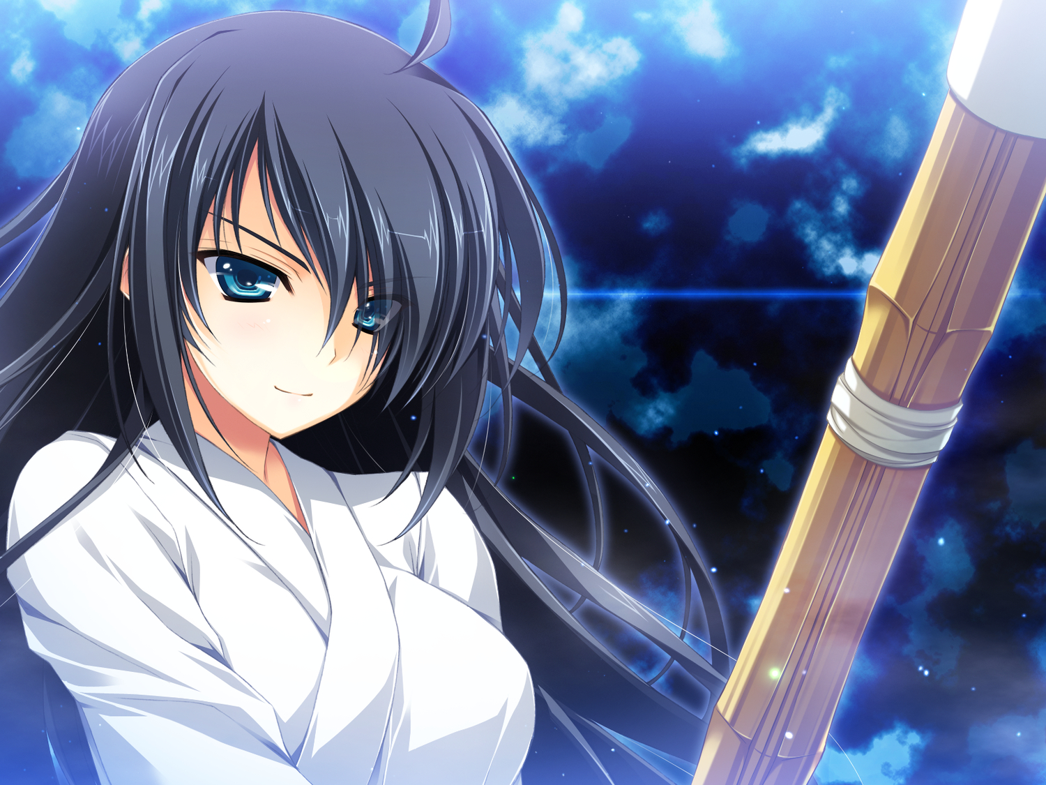 Description: A woman holding a large stick in her hand and looking at the camera with a blue sky in the background.