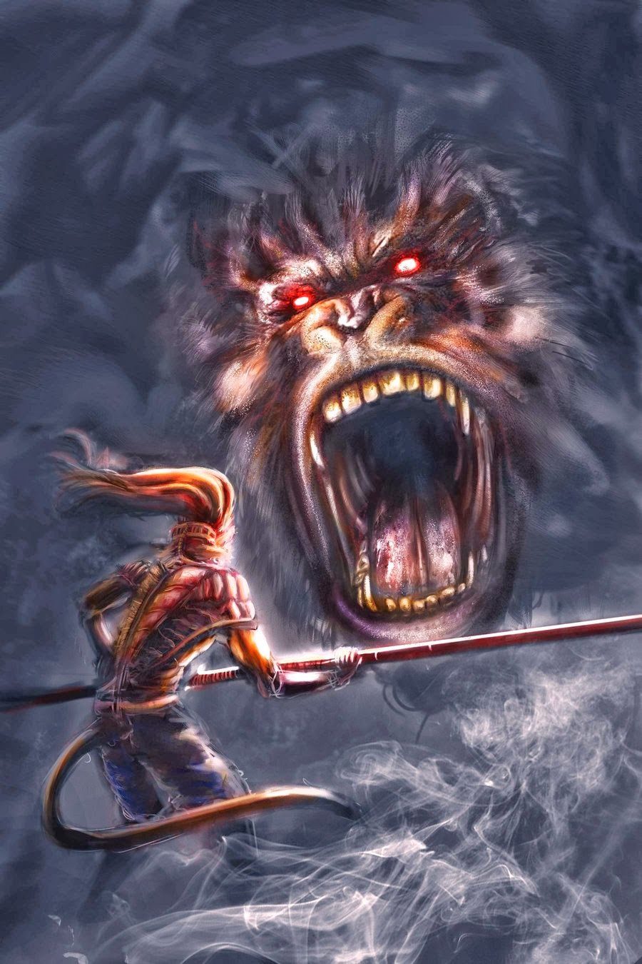 Description: A woman is holding a sword with a demon on it's back and a demon on the other side.