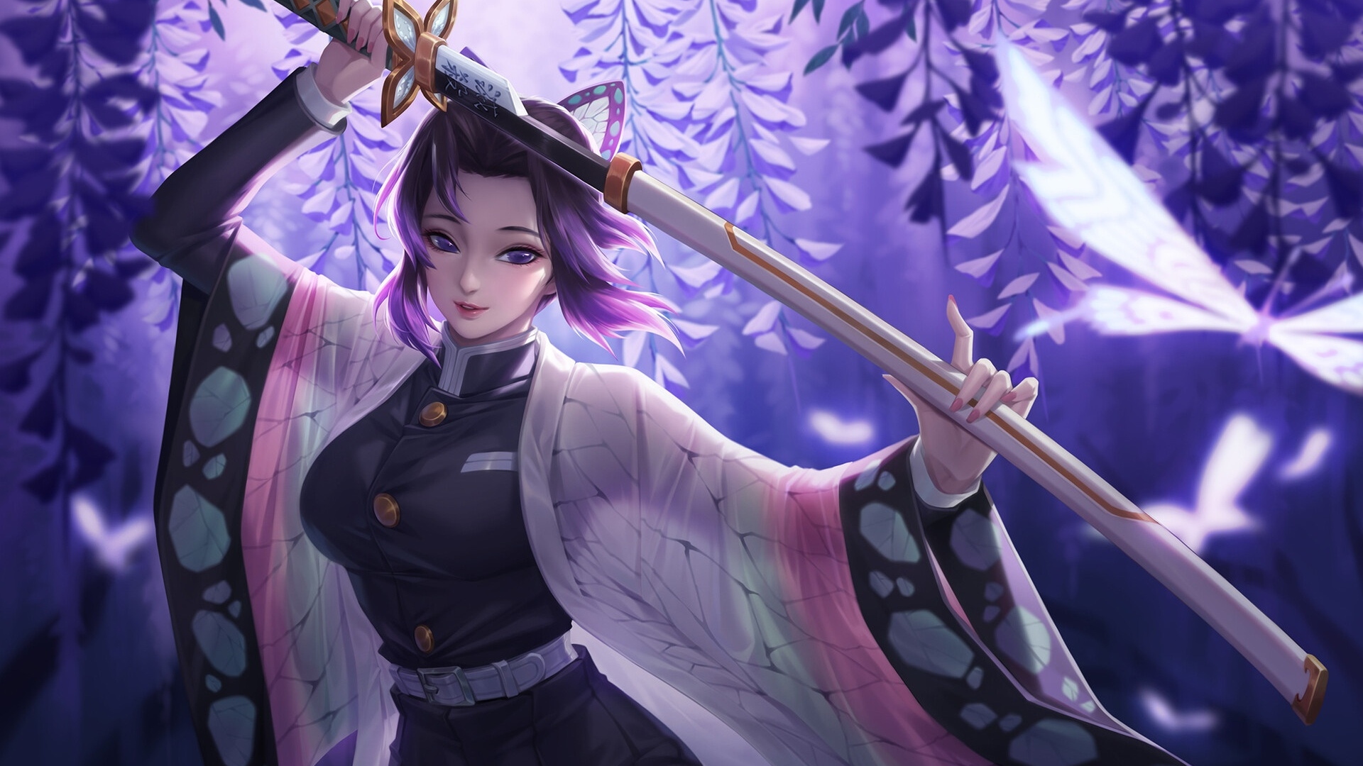 Description: A woman holding a sword in a forest with purple leaves on the background of a purple sky and a purple tree.
