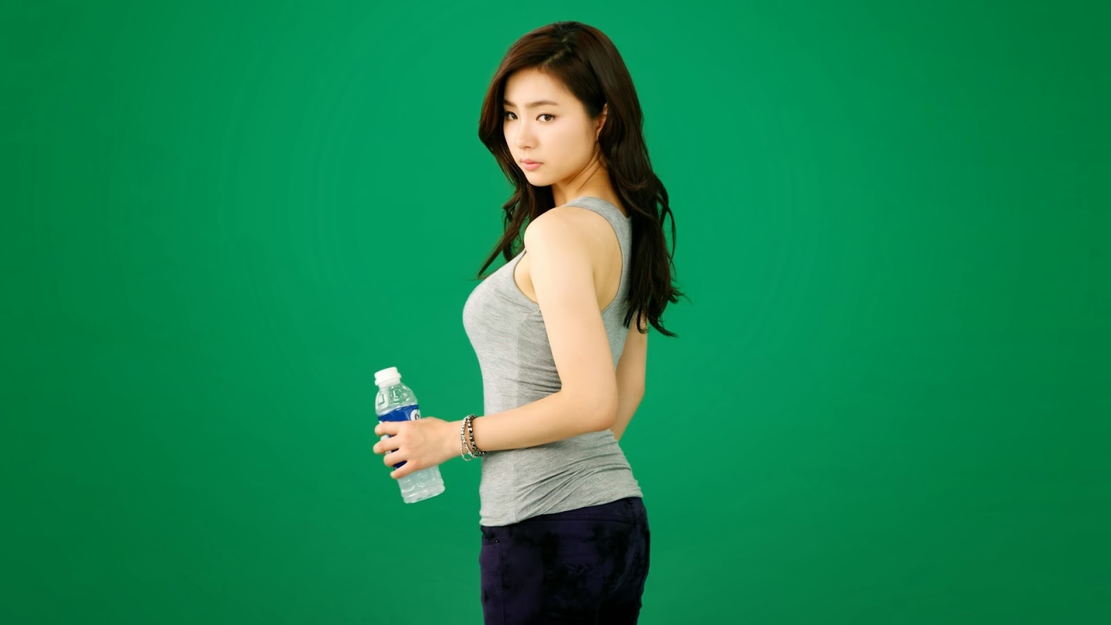 Description: A woman holding a bottle of water and a cell phone in her hand while standing in front of a green background.