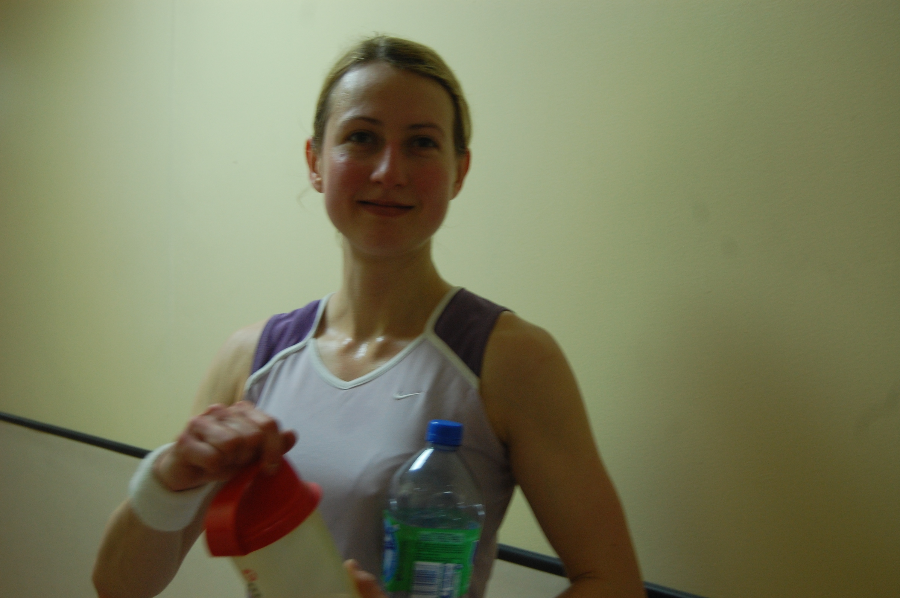 Description: A woman holding a bottle of water and a red rag around her neck and a red rag around her neck.