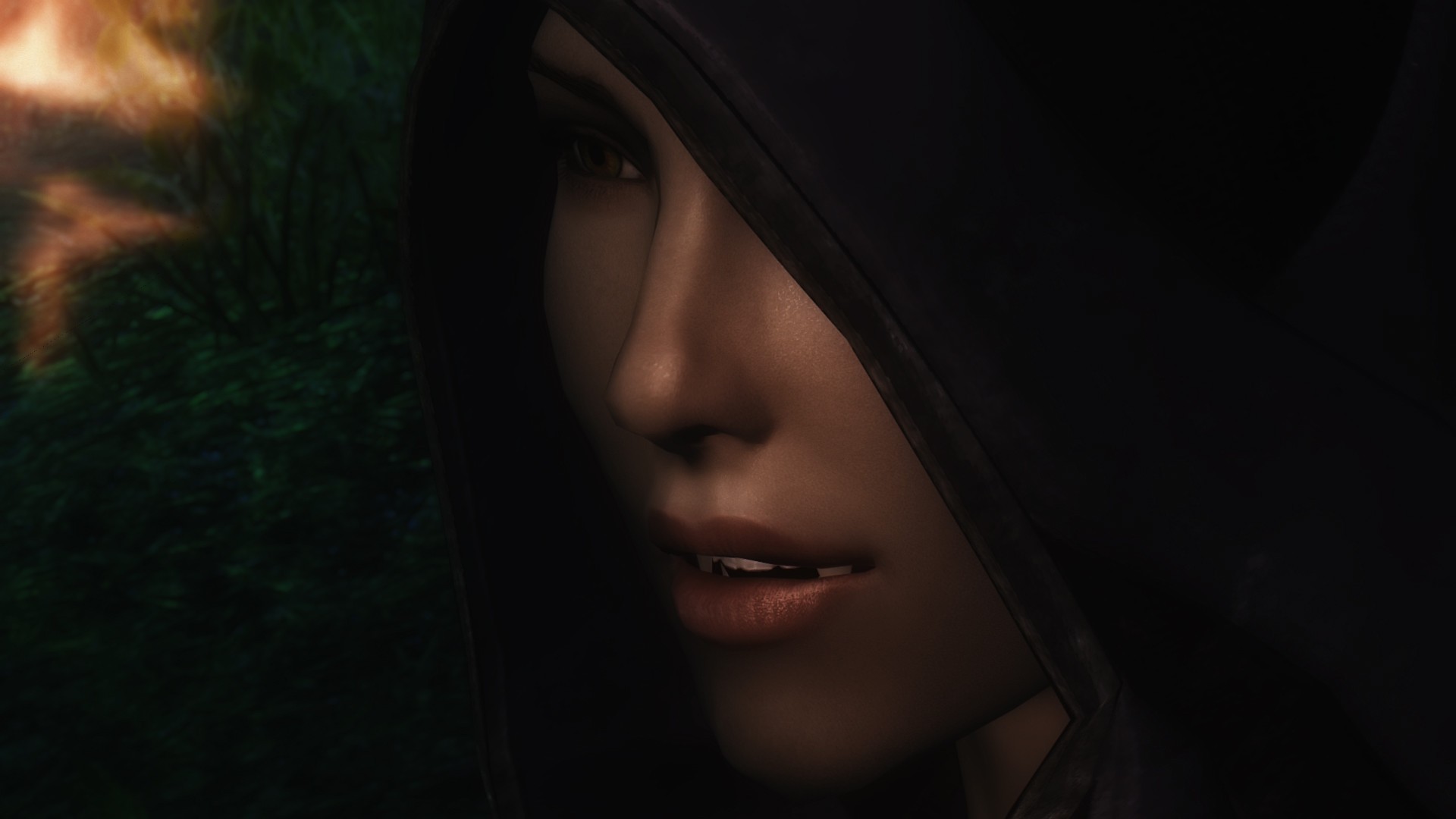 Description: A woman with a hood on in a forest with a fire in the background and a man in the background.