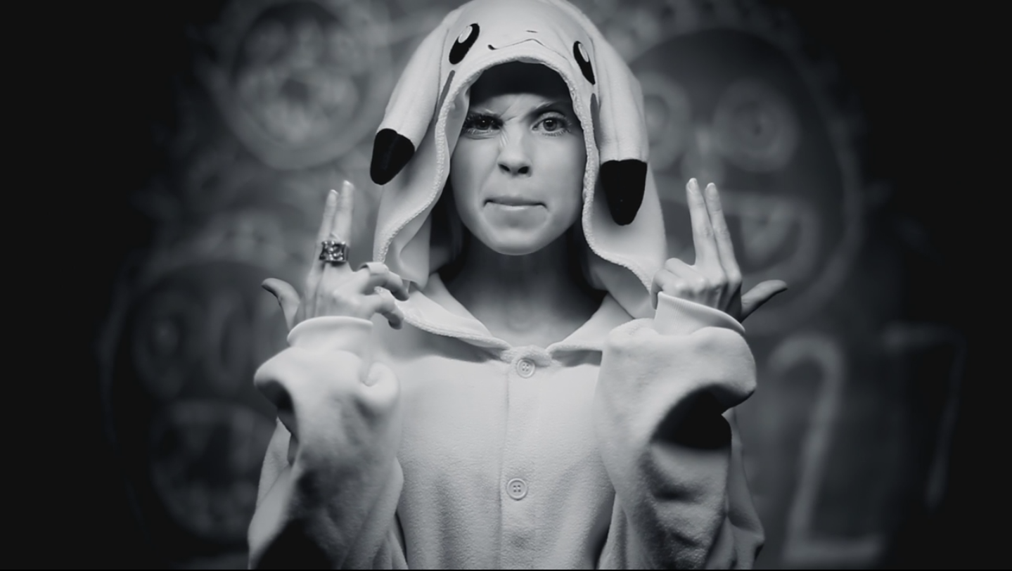 Description: A woman with a hood on holding two hands up to her face and wearing a hoodie over her head.