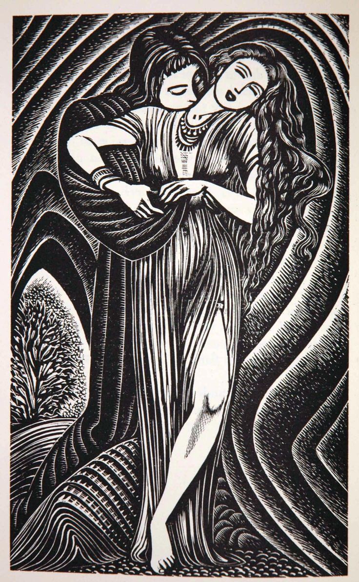 Description: A drawing of a woman hugging a man in a black and white image of a tree and water.
