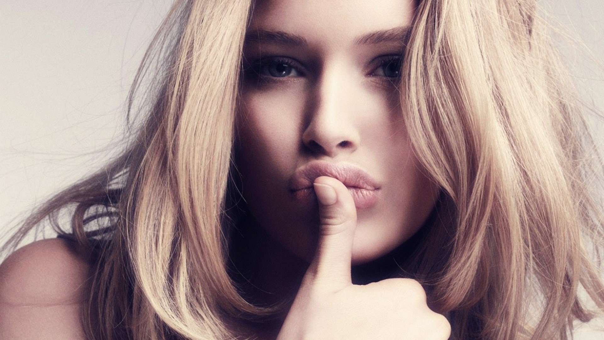 Description: A woman with a finger on her lips making a hush sign with her hand while she is holding her chin up.