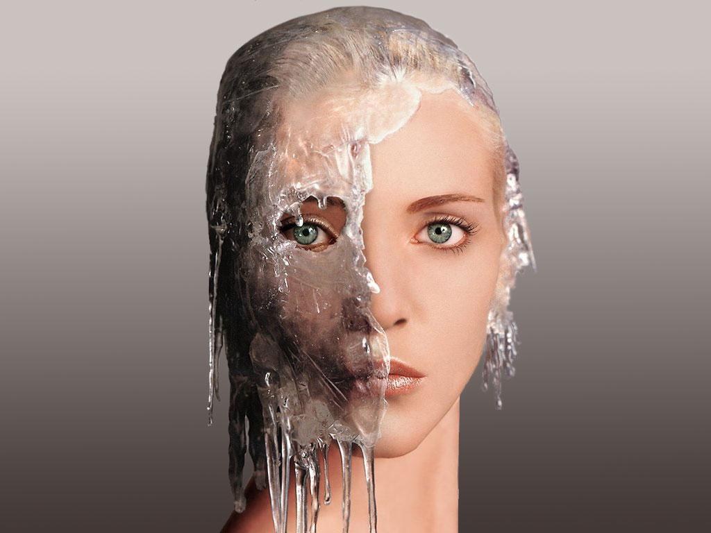 Description: A woman with a face covered in ice and icicles with a hair comb in her hand and a face with a face of ice on it.
