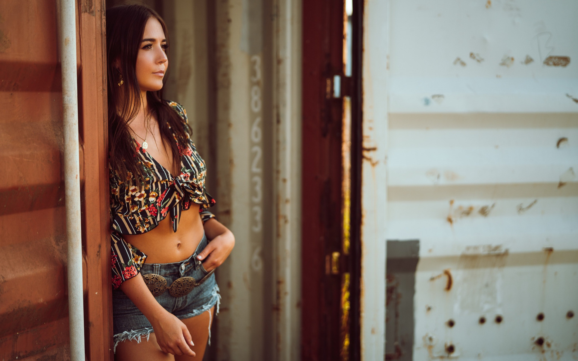 Description: A woman in a short jean shorts leaning against a wall with a knife in her hand and looking at the camera.