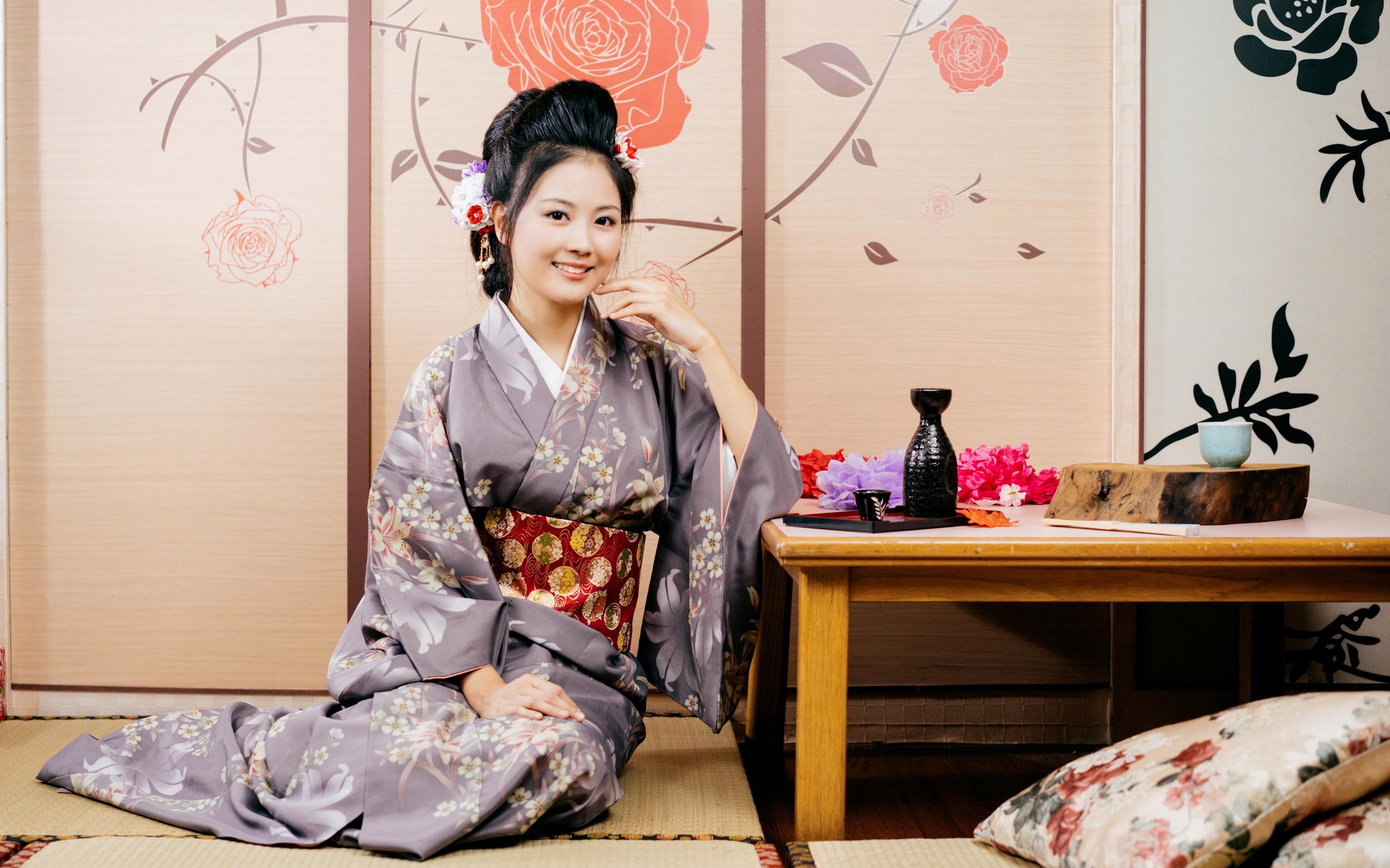 Description: A woman in a kimono sitting on a bed in front of a table with a bottle of perfume.