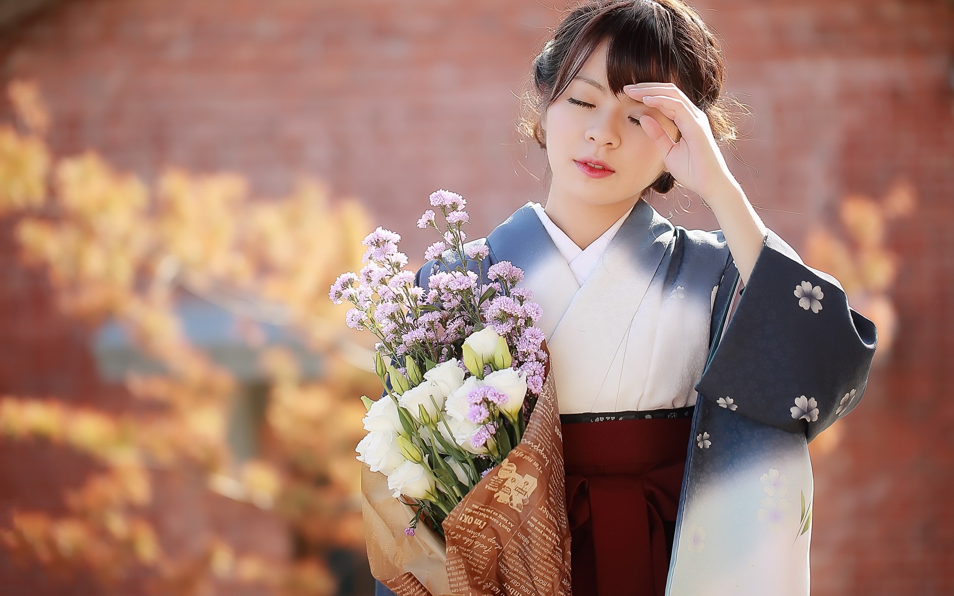 Description: A woman in a kimono holding a bouquet of flowers and a paper bag with a flower in it.